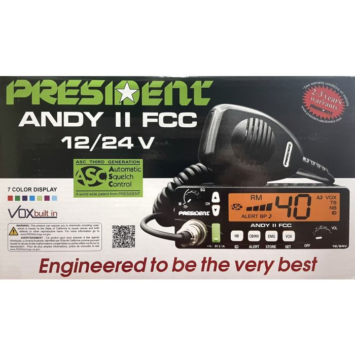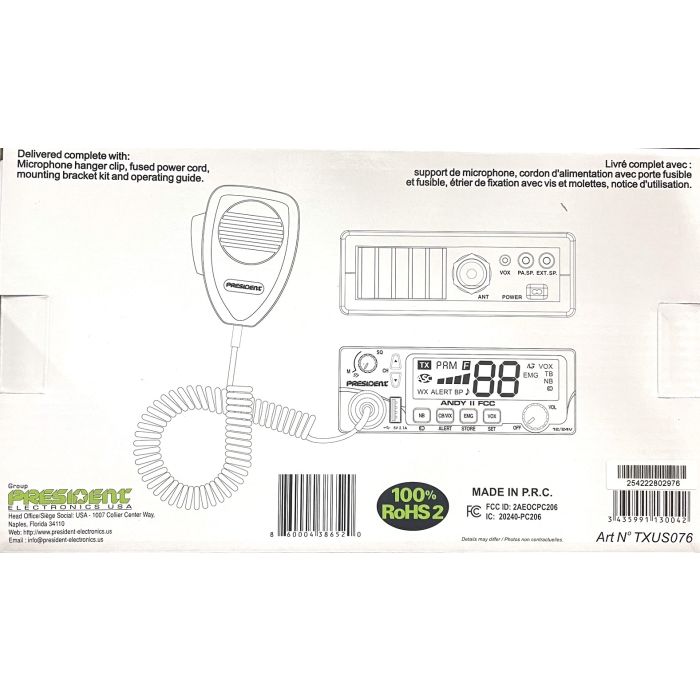 – 40 channels AM – 12 / 24 V – Up/down channel selector – Volume adjustment and ON/OFF – Manual squelch and ASC – Multi-functions LCD display – S-meter – ANL filter , NB – Noise Gate – F function key – Beep Function – EMG programmable – Talkback – Public Address – Weather channel with Alert – Front microphone plug – External loudspeaker jack